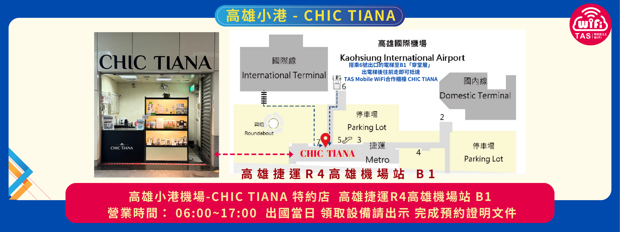 從現在起,您可以在 高雄小港機場 CHIC TIANA 特約店(高雄捷運 R4 高雄機場站 B1) 領取或歸還您的 TAS Mobile WiFi 設備。這項服務的開放,讓南台灣的旅客能夠享受更便捷的取還方式,不必擔心網路設備的領取時間或繁瑣手續。